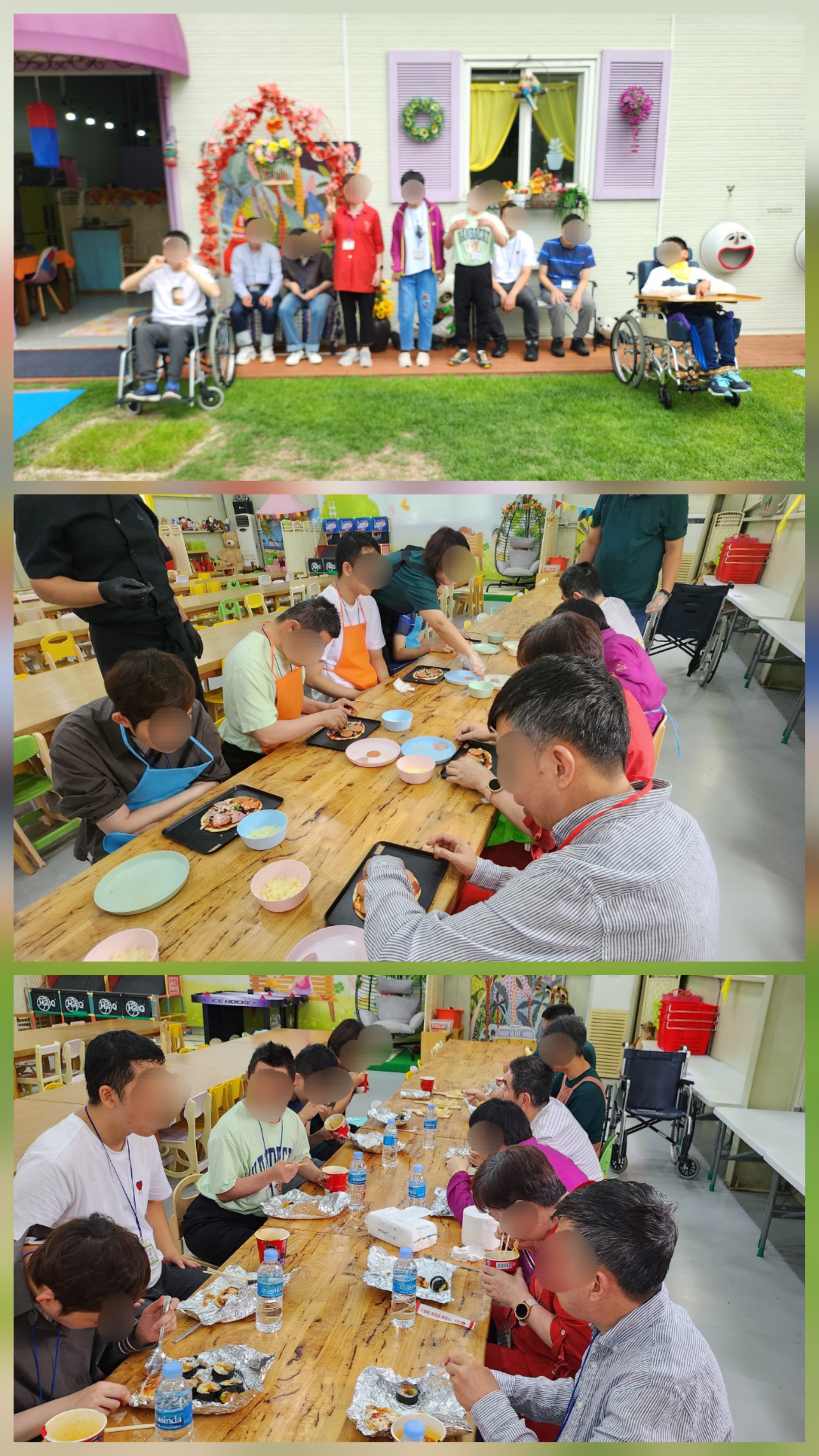 이용인들이 조물조물 반죽하고, 토마토소스 올리고 재료 올리고 치즈 듬뿍 얹어서 짠 하고 멋진 피자를 완성할 수 있었습니다.