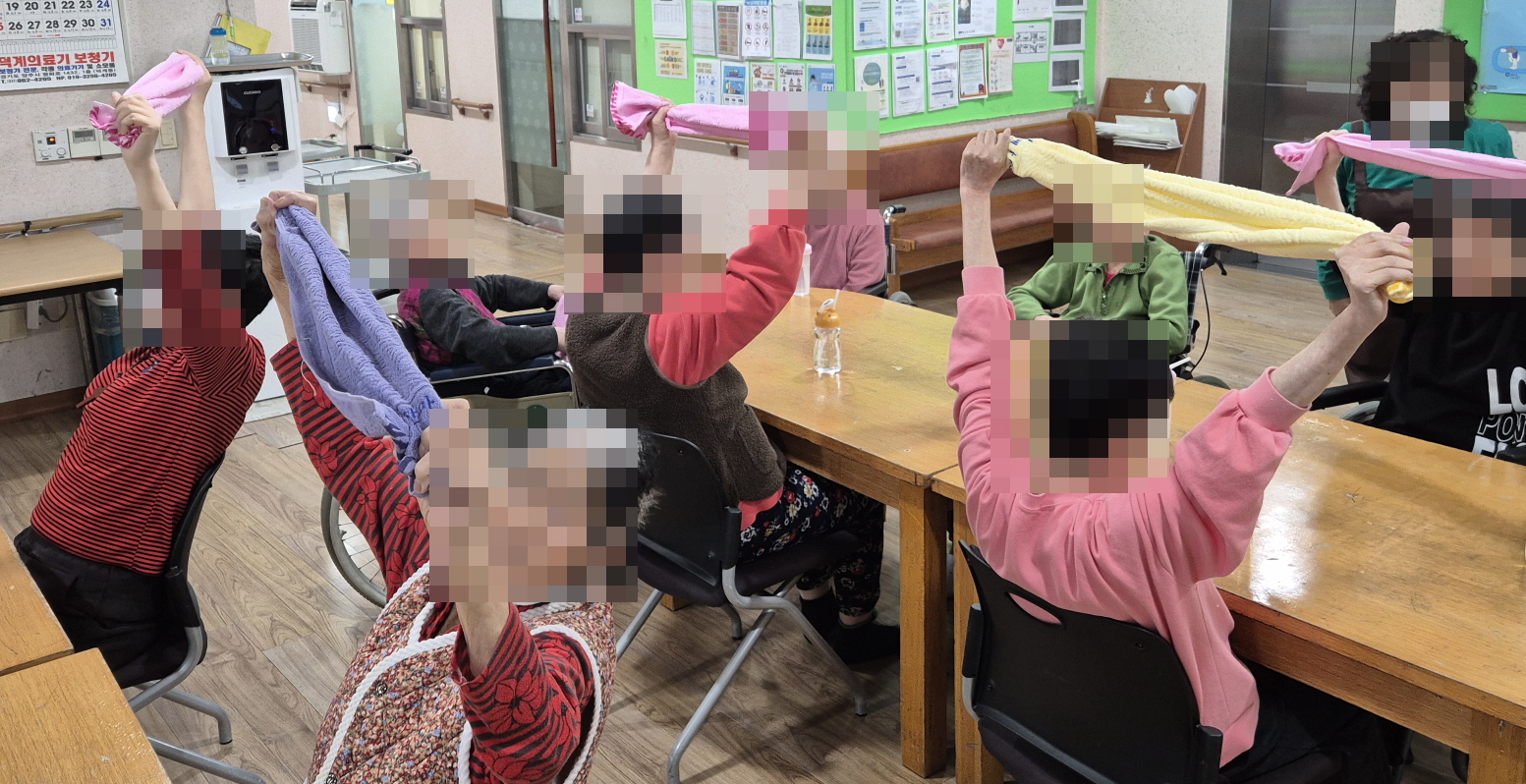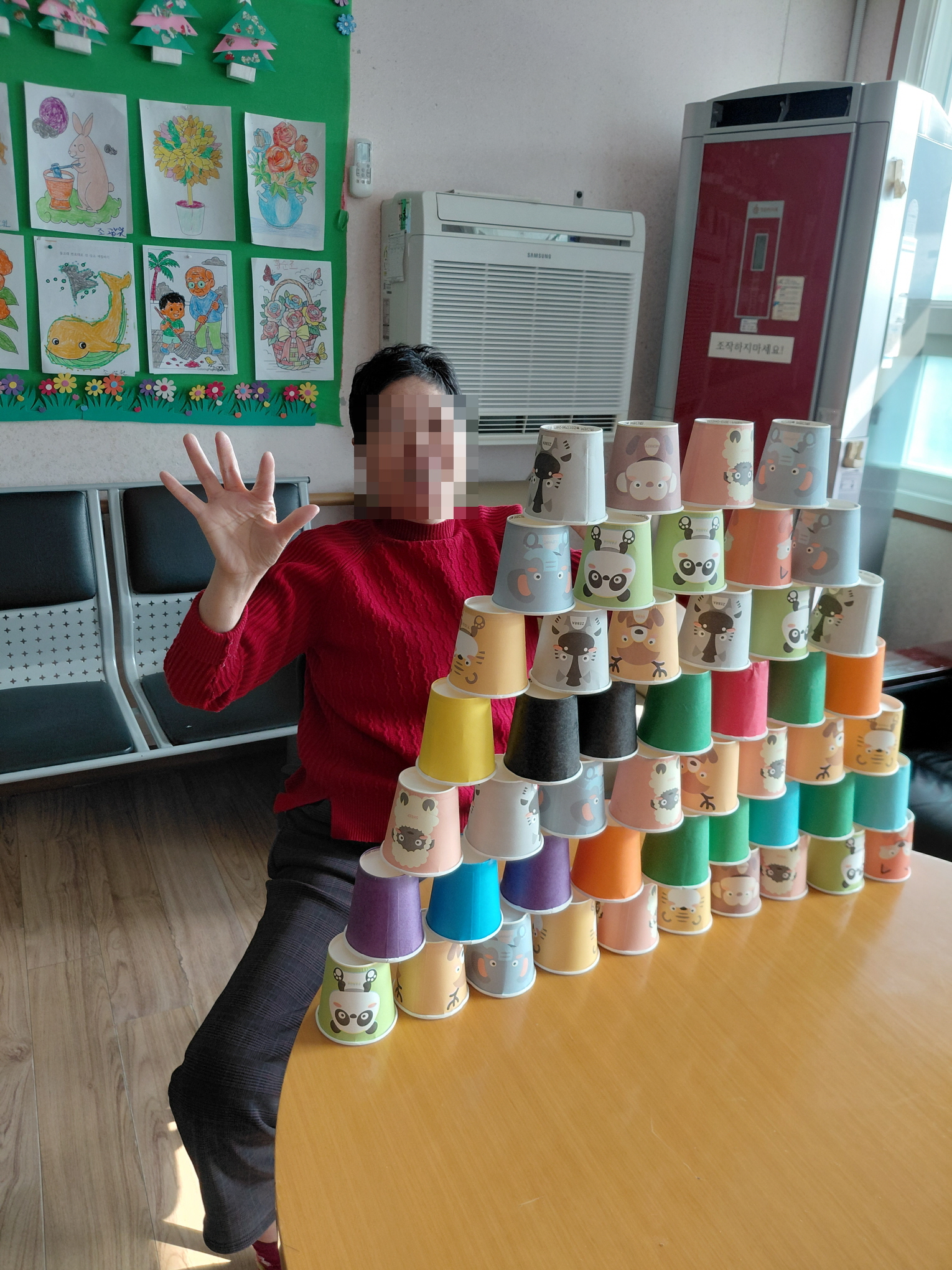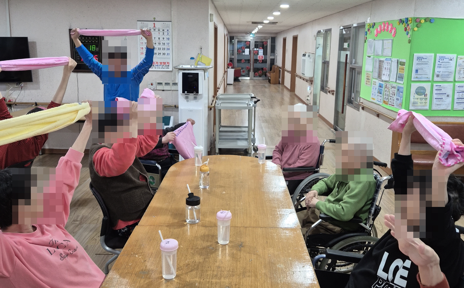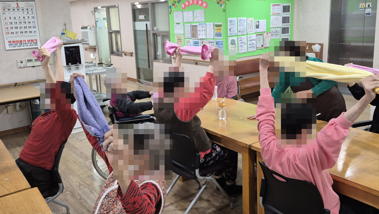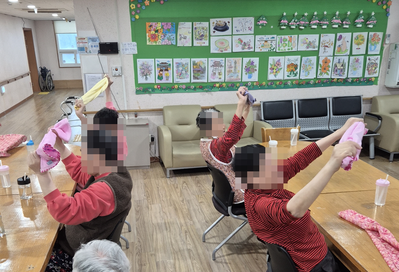 어르신들과 함께 수건체조, 컵쌓기 활동을 진행하였습니다. 수건을 활용한 체조로 어깨와 팔, 손목을 부드럽게 움직이며 근력 강화와 관절 유연성 향상에 도움을 주는 시간이었습니다. 어르신들께서 동작에 맞춰 적극적으로 참여하시며 즐거운 분위기 속에서 신체 활동을 마무리하였습니다. 앞으로도 어르신들의 건강 유지와 활력 증진을 위한 다양한 프로그램을 지속적으로 제공하겠습니다.