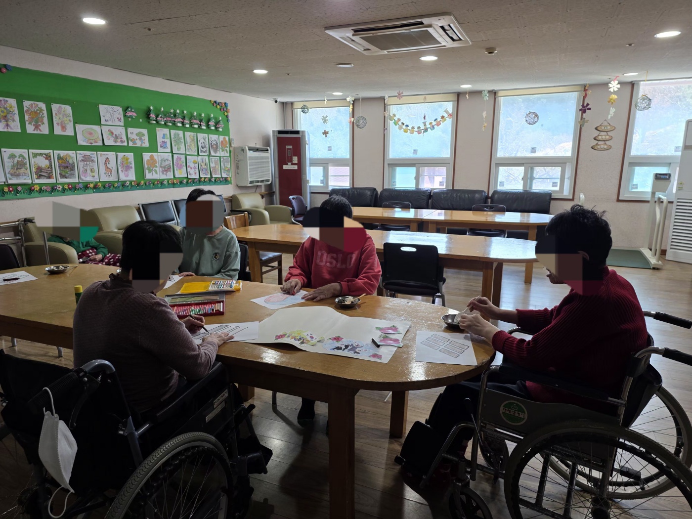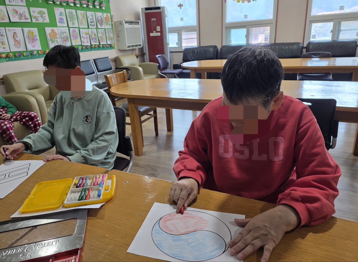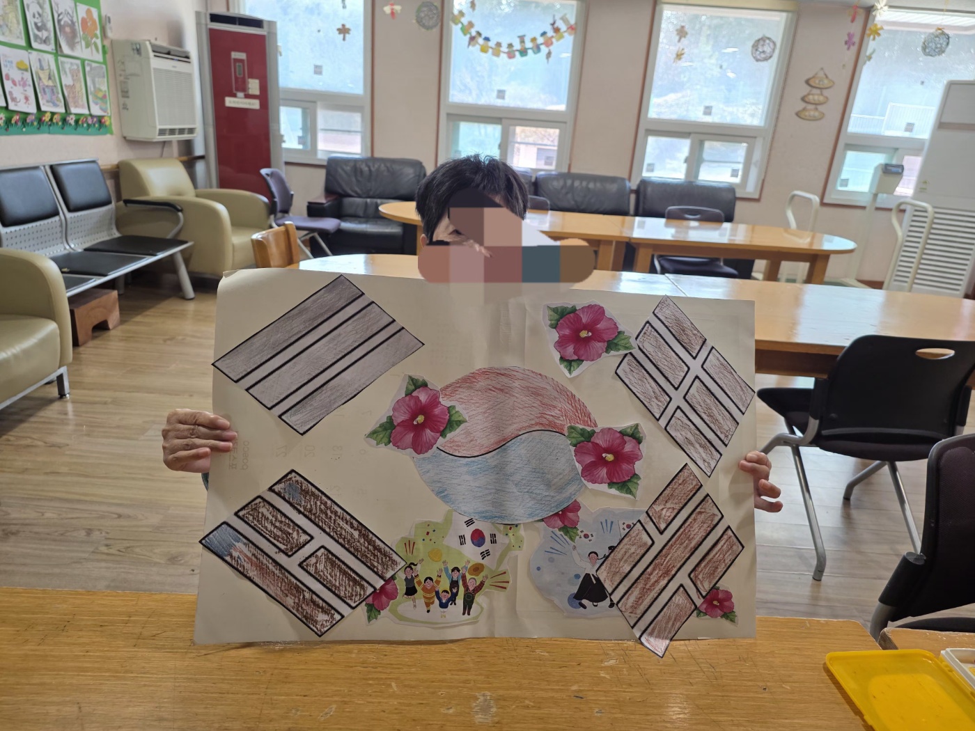 어르신들과 함께 태극기 협동화 만들기 활동을 진행하였습니다. 태극기의 의미와 모양에 대해 이야기 나누며 각자 맡은 부분에 색칠하고 함께 완성하는 시간을 가졌습니다.